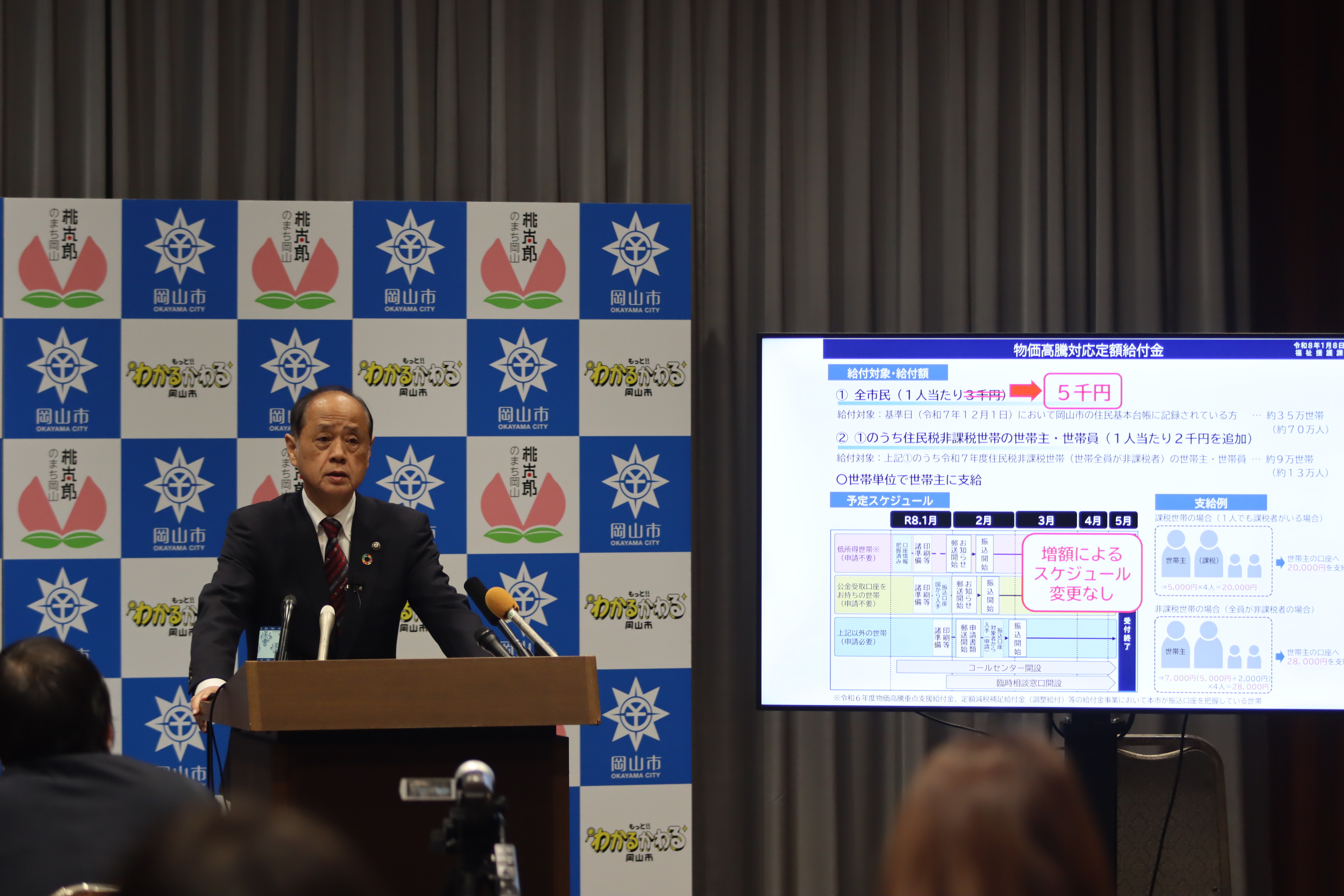 このスライドを見ていただきたいと思いますけれども、12月25日の会見でも少しお話し申し上げましたが、当初重点支援交付金は、昨年度交付額の3.3倍を目安にする旨の国通知を基に、岡山市では44億円程度来るものとして試算をしておりました。ただ、実際国の補正予算成立後に示された岡山市への交付額は、昨年度比4.4倍の約60億円となりました。想定より16億円多かったわけであります。この16億円の使い道としては、物価高騰に困っている市民にできるだけ早く届けることが必要だと考え、うち14億円を活用する形で市民1人当たりの給付額に2,000円を追加し、5,000円にすることにいたしました。