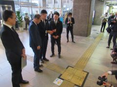公益社団法人岡山青年会議所からコード化点字ブロックが寄贈され、大森雅夫岡山市長がアプリを使った実演を行いました。