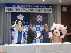 第4次「安全で安心なまちづくり」岡山市行動プランに関する覚書締結式が行われ、大森雅夫岡山市長が出席しました。
