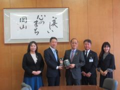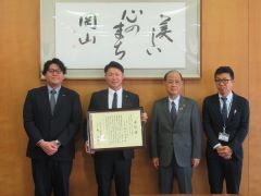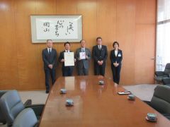グッドカンパニー大賞で優秀企業賞を受賞した協和ファインテック株式会社の橋本宗幸代表取締役社長と関係者が、大森雅夫岡山市長を表敬訪問しました。