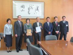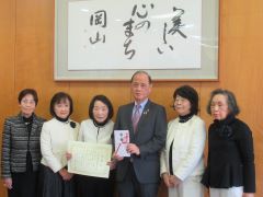 岡山市連合婦人会から心豊かな岡山っ子応援団へ、「愛の募金」を原資とする寄附金が贈呈され、大森雅夫岡山市長が受け取りました。