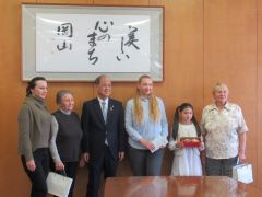 ウクライナ避難民家族が市役所を訪れ、大森雅夫岡山市長から募金の贈呈が行われました。