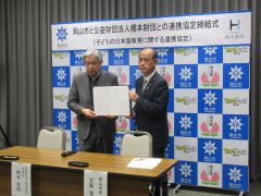 岡山市と公益財団法人橋本財団との子どもの日本語教育に関する連携協定締結式が開催され、大森雅夫岡山市長が出席しました。