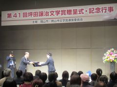 第41回坪田譲治文学賞贈呈式が開催され、受賞者の北澤平祐さんに、大森雅夫岡山市長が賞の贈呈を行いました。