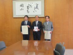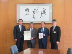 有限会社吉美、有限会社吉備環境設備からのアリーナ整備事業に係る寄附金の贈呈に対し、大森雅夫岡山市長が感謝状を贈呈しました。