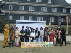 岡山城天守への年間最多来場者達成記念セレモニーが行われ、大森雅夫岡山市長が439,885人目の来場者に記念品の贈呈を行いました。